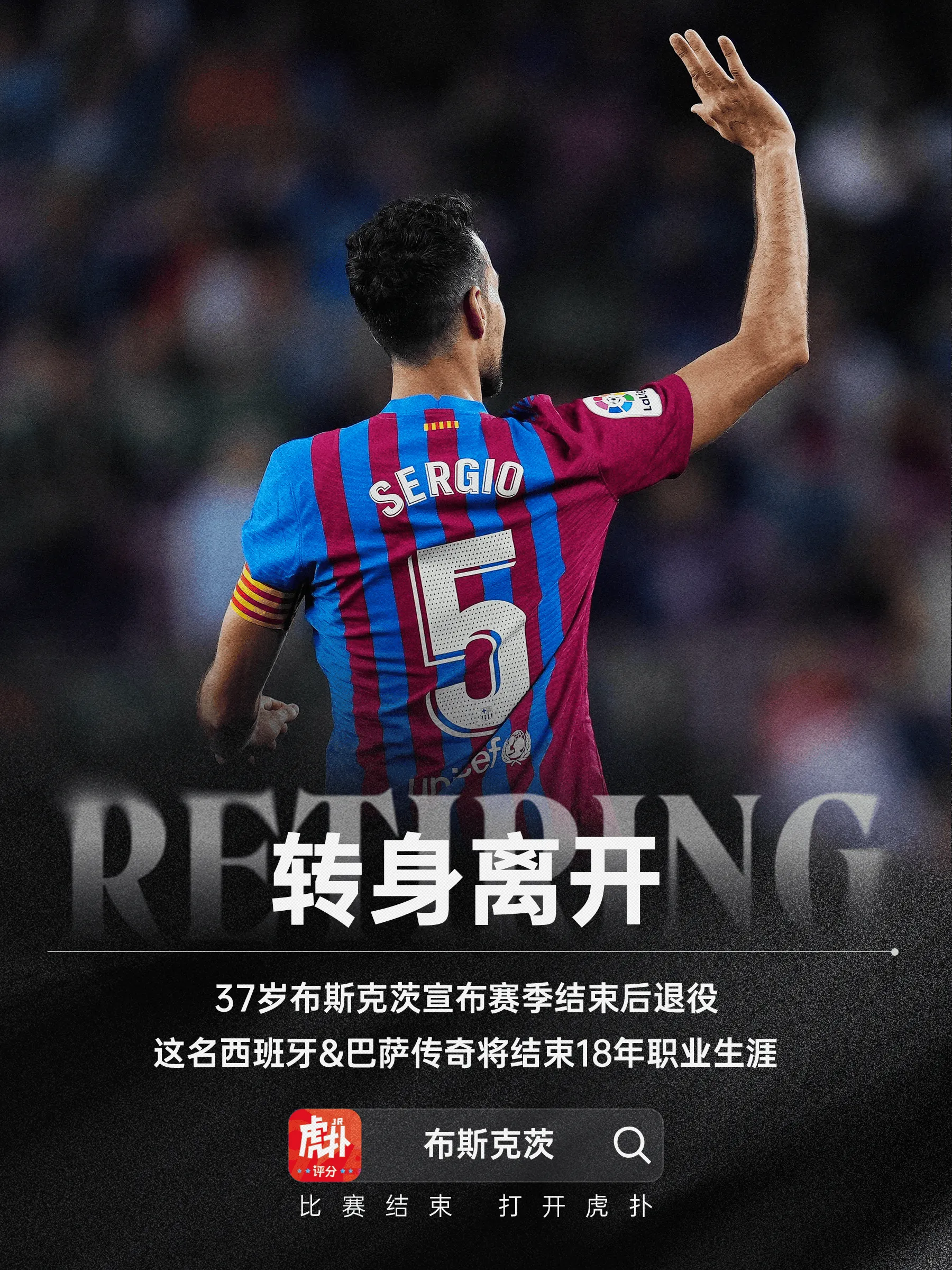 虎扑09月26日讯 西班牙传奇中场布斯克茨在社媒宣布,自己将在本赛季结束后退役。